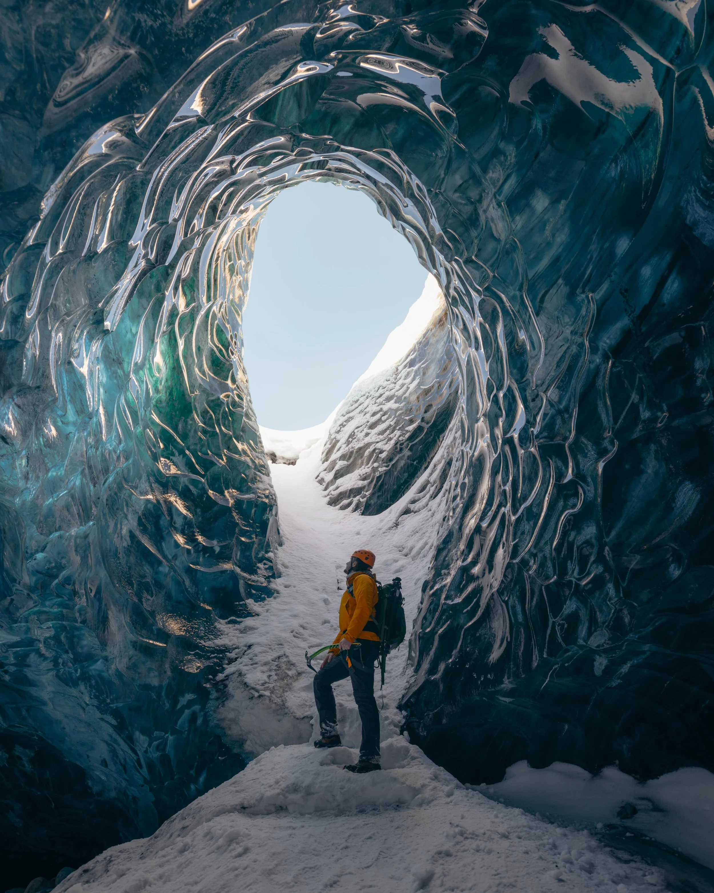 The Iceland terrain can take on a completely different form throughout the year. Winter however, leaves a cold chill and thin air topped off with Ice formations that are unlike anything that I have ever seen. We scaled a nearby glacier and walked underneath ice which aged thousands of years old. Each step revealed a part of the country that is etched away in time and revealing small symbols from the past. The dark blue ice held small bits of ash from volcanic eruptions that took place thousands of years ago.